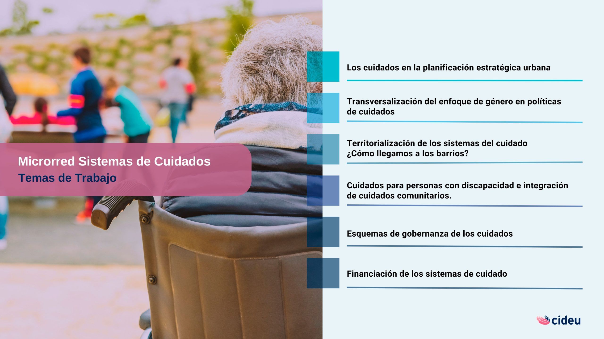 Para el 2024, esta microrred se ha planteado trabajar en los sistemas de cuidado haciendo énfasis en experiencias y aprendizajes sobre temas y elementos que permitan profundizar la dimensión territorial e implementación de las políticas y sistemas de cuidado, desde su inclusión en los procesos de planificación estratégica urbana hasta su despliegue en los territorios y las complejidades que ello supone.