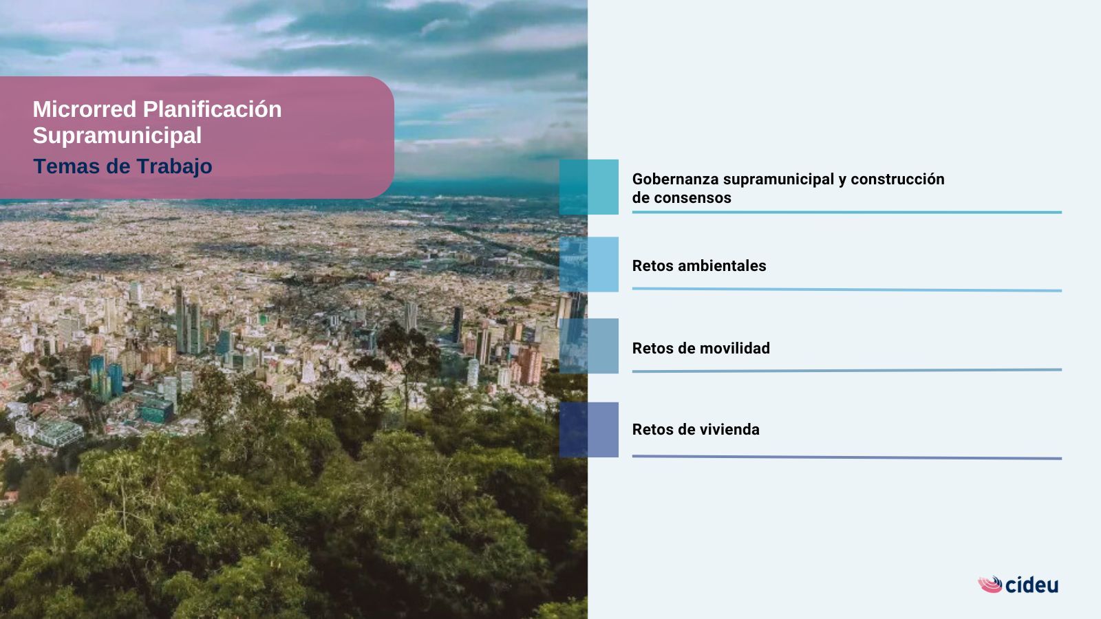 La Microrred de Planificación Supramunicipal se desarrolla en el marco del proyecto “Incorporación de la dimensión supramunicipal en la planificación y gestión de gobiernos locales de Latinoamérica”, una iniciativa financiada por la Diputación de Barcelona y ejecutada por CIDEU, que tiene como objetivo mejorar la planificación estratégica abordando desafíos y oportunidades que afectan a una región más amplia y trascienden los límites municipales.